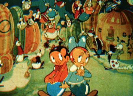 Iwerks and Walt Disney first met as teens in Kansas City forming a powerful collaboration and friendship. Iwerks was the artistic heart of the company developed by Disney in the ’20s serving as head animator and Disney’s chief character designer and co-creator of Mickey Mouse. Iwerks moved on to MGM to experiment with color on the first Flip the Frog cartoon Fiddlesticks (1931), and also with Willie Whopper in the pre-code short Hell’s Fire (1934). His elaborate mid-30s “ComiColor” series included Jack and the Beanstalk (1933) and Balloon Land (1935). Iwerks concluded his solo career at Columbia Pictures with their “Color Rhapsodies” cartoons including Merry Mannequins (1937), an art deco masterpiece paying tribute to the Fred and Ginger musicals of the era.