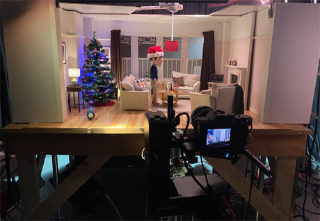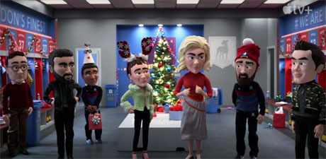 We created that introduction sort of reimagining the live-action intro with Jason coming into the stadium, but then we had to add-in all the other characters as well. So we took that formula and format and brought it into the animation world. Everybody really liked it and responded to it. So they came back to us maybe six months later. I think we shot the intro in March [2021] and then they came back in August and said, “Hey, Jason has an idea for a Christmas special — a standalone for AppleTV as a little love letter to the fans.” We thought it was fantastic. We had already built the puppets. We have some of the assets. It was really easy for us to pop-up a few stages. We got to build the locker room, which was amazing.